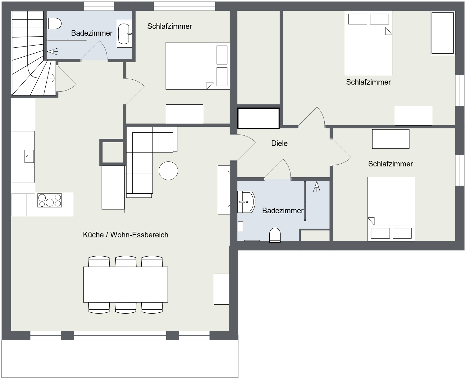 - 3 Schlafzimmer mit je einem Doppelbett (180 x 200, Betten sind fertig bezogen)